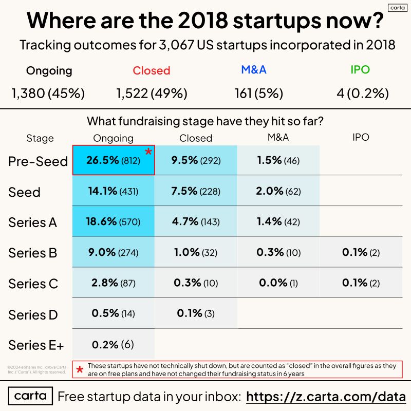 Carta published data on “Where are the 2018 startups now” that showed that 5.2% of startups incorporated in 2018 were acquired. You can see the original post on LinkedIn here. Of the 3,067 US startups in their data set, 161 were acquired (and another 4 went public). Since Carta serves such a large percentage of the VC-funded startup market, we think this is a valid average for how the average startup performs.